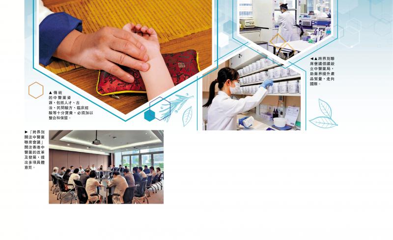 左上图:传统的中医药资源,包括人才、古法、民间验方、临床经验等十分宝贵,必须加以整合和保留。左下图:“跨界别关注中医药联席会议”关注香港中医药的改革及发展,提出多项具体意见。右图:跨界别联席会议倡议设立中医药局,助业界提升产品质量,走向国际。