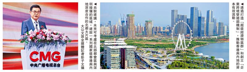 左图:肖耿建议,未来可考虑在北部都会区与深圳接壤的区域,建设一系列国家级香港与内地深度合作的北都大片区。\大公文汇全媒体记者彭子文摄;右图:透过打造“超级经济特区群”和创立“企业跨境双总部机制”,推动香港与内地的资本有效流动。