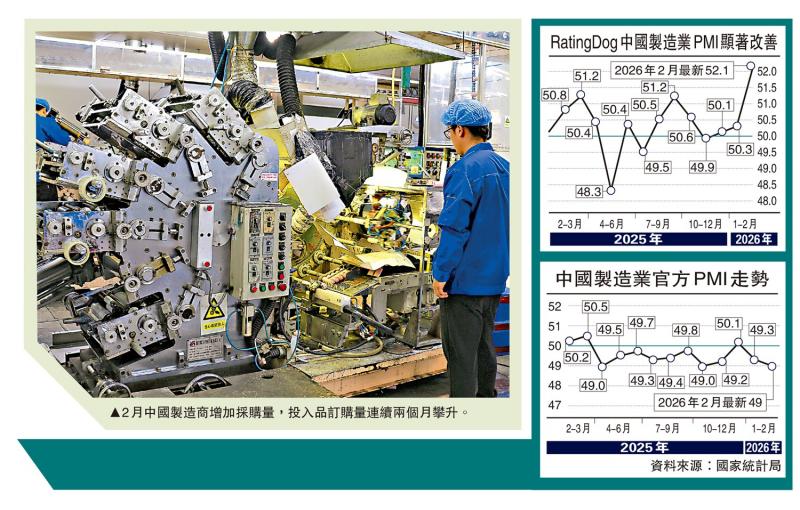 中国制造业运行呈现显著“淡季不淡”特征。标普和RatingDog(RD)昨日发布的2月中国制造业PMI报52.1,较前值升1.8个百分点,改善度为2020年12月以来最劲。国家统计局同日发布的2月中国制造业PMI则按月回落0.3个百分点至49,但大型企业景气度加快扩张等积极因素仍续累积。分析称,季节性扰动环境中,中国制造业仍展现出较强韧性。在全国两会政策密集发布窗口期,市场信心将显著提振,本月制造业景气度大概率趋稳回升运行。\大公报记者 倪巍晨