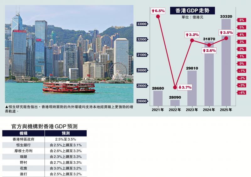 恒生银行经济研究部发表报告指出,随着本地及外围需求增加,为整体经济带来支持,因此上调今年香港经济增长预测至3.1%。报告又提到,资产市场表现强劲造就财富效应,加上美元走弱和人民币走强,料增强香港零售业的竞争力。\大公报记者 李洁仪
