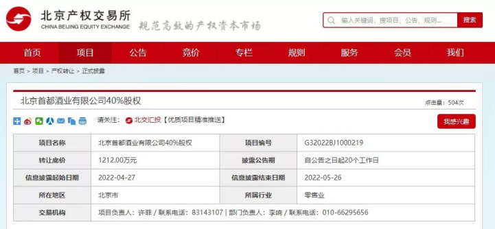 大公消费讯 5月18日,据北京产权交易所信息,北京首都酒业有限公司将转让40%股权。此次转让方为北京北控京泰投资管理有限公司,转让底价为1212万元。