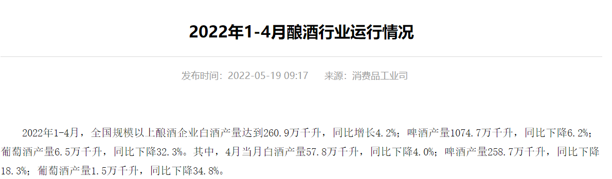 数据显示,2022年1-4月,全国规模以上酿酒企业白酒产量达到260.9万千升,同比增长4.2%;啤酒产量1074.7万千升,同比下降6.2%;葡萄酒产量6.5万千升,同比下降32.3%。其中,4月当月白酒产量57.8万千升,同比下降4.0%;啤酒产量258.7万千升,同比下降18.3%;葡萄酒产量1.5万千升,同比下降34.8%。