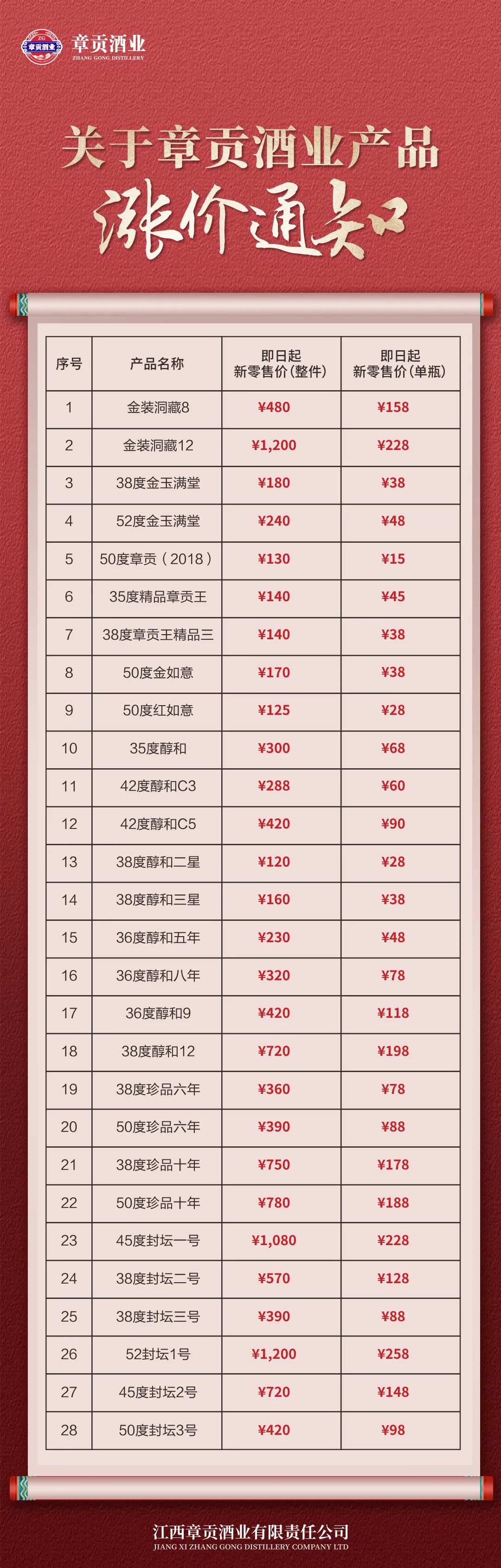 据了解,因白酒原材料价格、人工成本、仓储管理及物流成本均出现不同幅度上涨,企业生产经营成本不断上升,章贡酒业旗下金装洞藏8、金装洞藏12、38度金玉满堂等共28款产品涨价。
