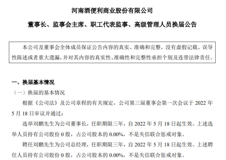 大公消费讯 5月20日晚间,河南酒便利商业股份有限公司发布董事长、监事会主席、职工代表监事、高级管理人员换届公告。