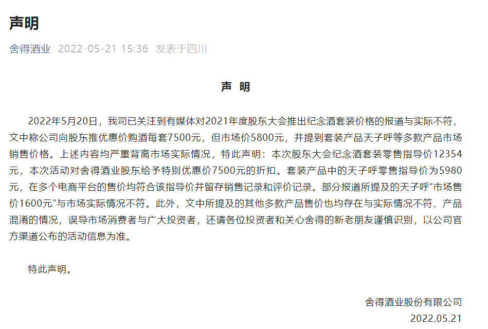 大公消费讯 5月21日,舍得酒业发布声明公告称,有媒体对2021年度股东大会推出纪念酒套装价格的报道与实际不符。