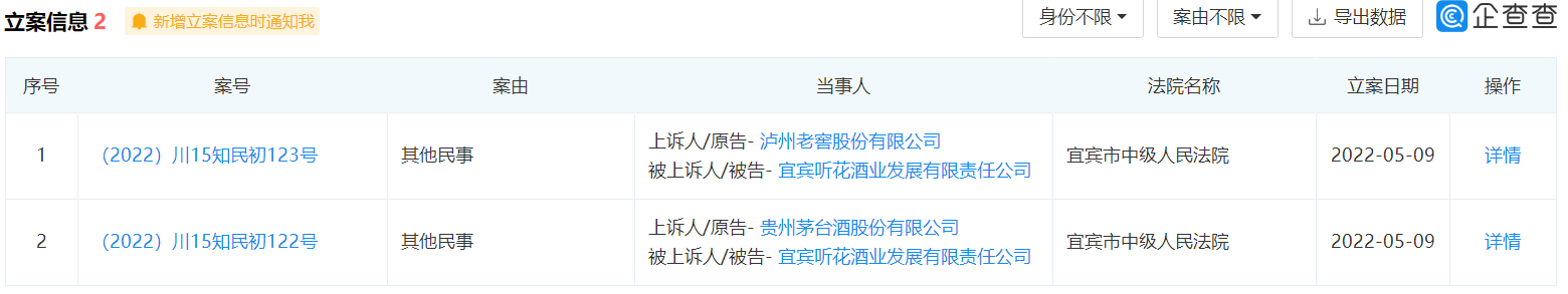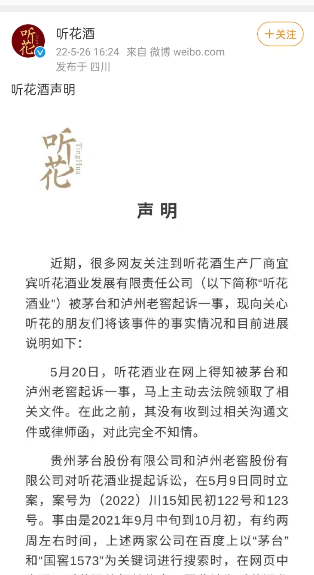 声明显示,5月20日,听花酒业在网上得知被茅台和泸州老窖起诉一事,马上主动去法院领取了相关文件。在此之前,其没有收到过相关沟通文件或律师函,对此完全不知情。