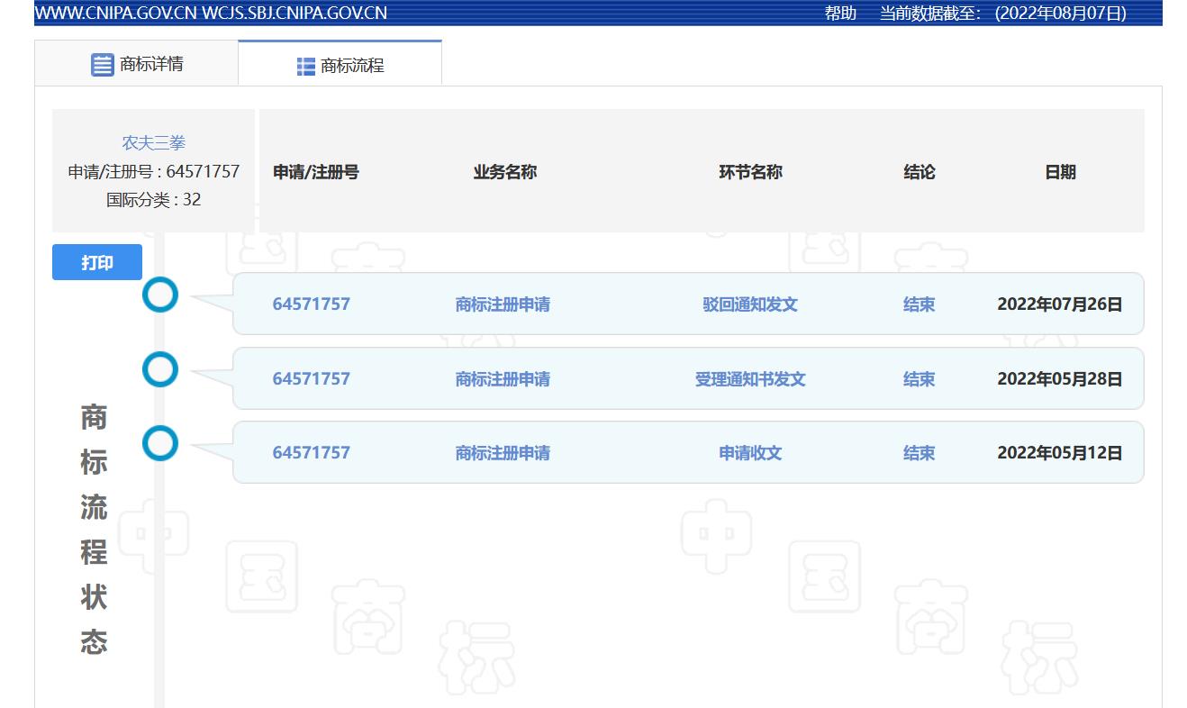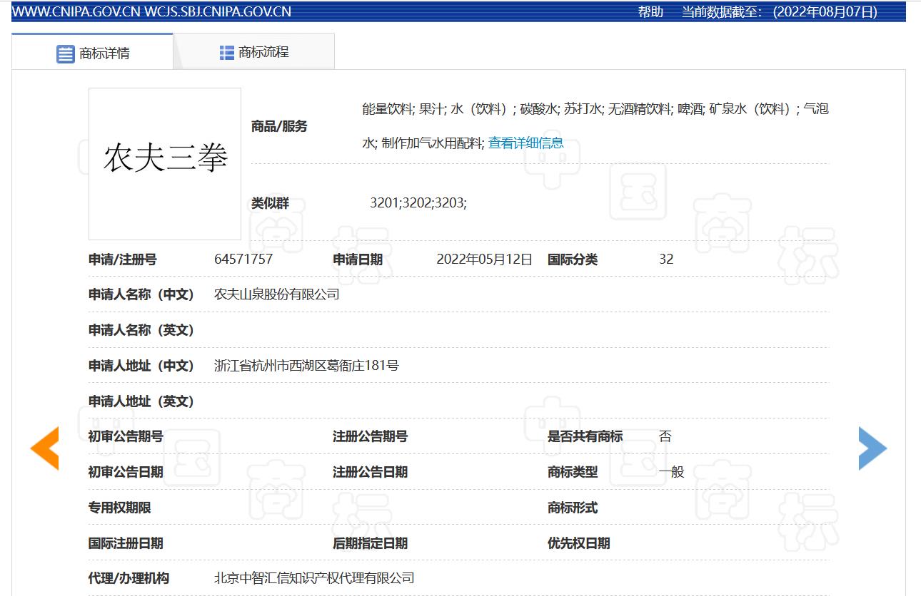 大公快消讯 根据中国商标网8月9日查询信息显示,近日,农夫山泉股份有限公司于今年5月申请注册的“农夫三拳”商标,流程状态变更为驳回通知发文,国际分类为啤酒饮料。