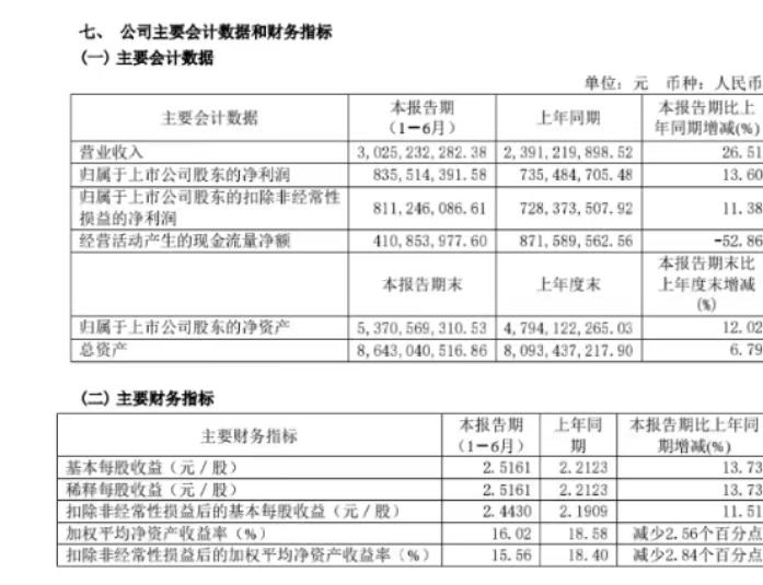 报告显示,今年上半年,公司实现营业收入30.25亿元,同比提升26.51%;归属于上市公司股东的净利润为8.36亿元,同比提升13.6%。