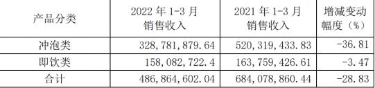 数据显示,2022年第一季度香飘飘营业收入不到4.96亿元,同比降幅在28.28%左右;归属于上市公司股东的净利润约为-5968万元,与2021年同期298万元相比,下滑2106%左右;归属于上市公司股东的扣除非经常性损益的净利润也为负数,约为-7435万元,而2021年第一季度则在-1120万元左右。