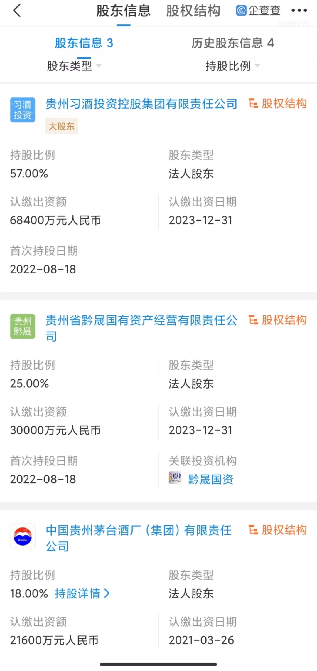 与此同时,新增贵州国资委实际控股公司贵州省黔晟国有资产经营有限责任公司、贵州习酒投资控股集团有限责任公司,持股比例分别为25%、57%;中国贵州茅台酒厂(集团)有限责任公司仍持股18%,没有变动。