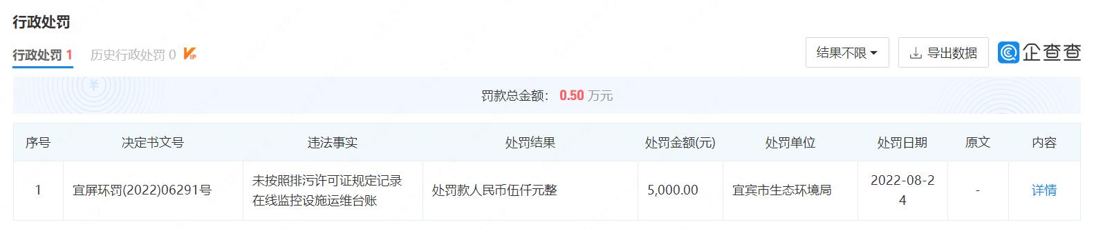 大公快消讯 据企查查官网,近日,宜宾听花酒业发展有限责任公司因未按照排污许可证规定记录在线监控设施运维台账,被宜宾市生态环境局处罚款5000元,处罚依据为《排污许可管理条例》第三十七条第(一)项。