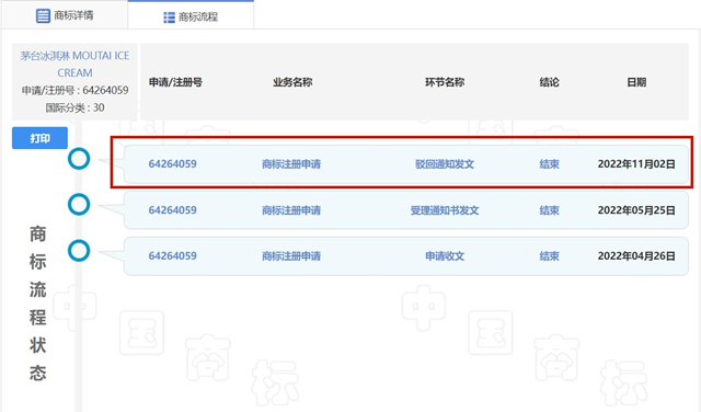 大公快消讯 11月18日,大公快消从国家知识产权局商标局获悉,中国贵州茅台酒厂(集团)有限责任公司申请的方便食品类“茅台冰淇淋 MOUTAI ICE CREAM”商标,已于11月2日被驳回通知发文。不过相关信息显示,该次驳回仅为“部分驳回”。
