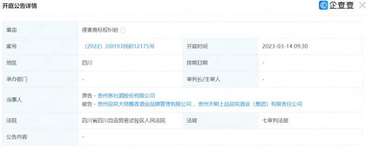 企查查显示,贵州茅台于近日起诉贵州天朝上品迎宾酒业(集团)有限责任公司(以下简称“天朝上品迎宾酒业”)、贵州迎宾大师酱香酒业品牌管理有限公司,案件诉讼案由为“侵害商标权纠纷”,于2023年3月14日,该案件将在四川自由贸易试验区人民法院开庭。