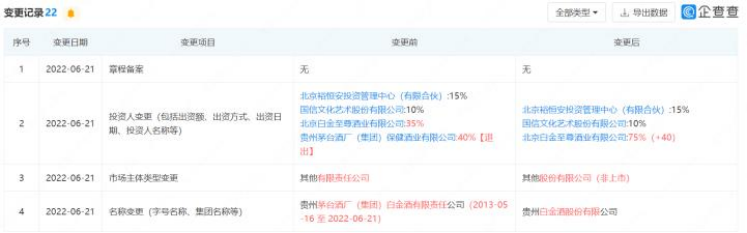 而天朝上品迎宾酒业关联公司天朝上品酒业(贵州)有限公司(以下简称“天朝上品”)曾是贵州茅台酒厂(集团)技术开发公司(简称“茅台技开公司”)旗下控股子公司。2022年10月13日,天朝上品发生工商变更,茅台技开公司退出其股东行列。