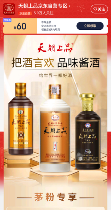 1月15日,大公快消在天朝上品京东自营专区发现,其产品“众人酒”、“5G商务酒”产品包装上仍带有“贵州茅台集团”的标识,专区首页还标有“茅粉专享”字样。