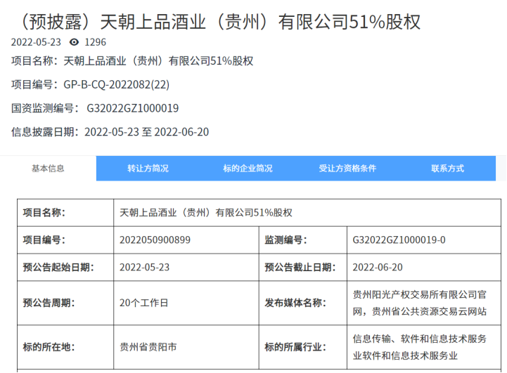 2022年5月23日,贵州阳光产权交易所有限公司官网显示,经茅台集团董事会批准,茅台技开公司拟以6635.53万元转让天朝上品51%股权。