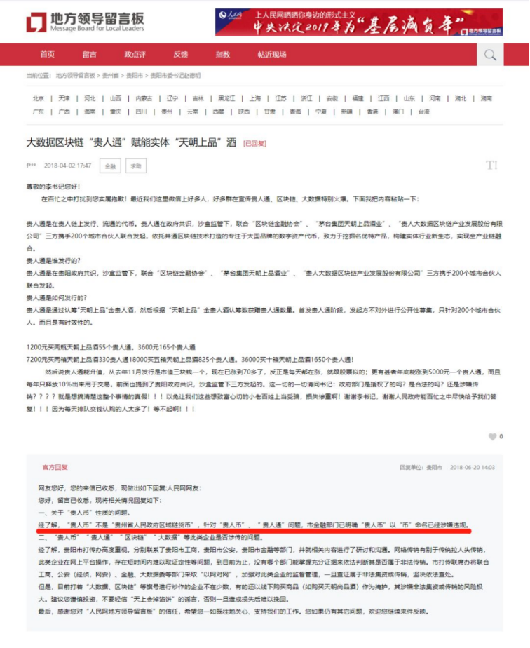 人民网领导留言板信息显示,2018年有网友留言称,“贵人通”价格从发行之后每天都在涨,这是否有政府部门授权、是否涉嫌传销等问题。对此,贵阳市政府方面称,市金融部门已明确“贵人通”以“币”命名已经涉嫌违规。