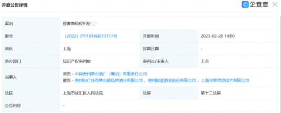 大公快消讯 企查查显示,2月4日,中国贵州茅台酒厂(集团)有限责任公司新增一则开庭公告,被告为贵州国登酒业股份有限公司、上海寻梦信息技术有限公司、贵州省仁怀市茅台镇私房酒业有限公司,案由为侵害商标权纠纷,将于2月20日开庭。