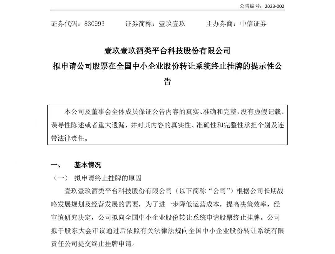 大公快消讯 2月7日,壹玖壹玖酒类平台科技股份有限公司(以下简称“壹玖壹玖”)发布公告,拟申请公司股票在全国中小企业股份转让系统(“新三板”)终止挂牌,壹玖壹玖称此举系根据公司发展规划的需要。