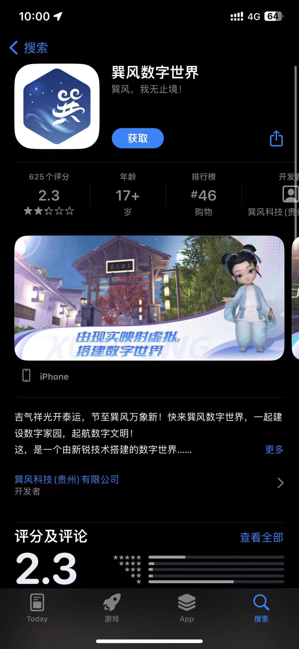 但是,在该APP上线不久后,就有玩家在苹果应用商店中对巽风数字世界打出1星评分,并在评论中吐槽“游戏开放注册时间推迟了一小时”、“多次进行身份验证却显示不正确”、“联系客服转接人工会被挂断电话”等。截至目前,巽风数字世界APP在苹果应用商店的评分仅有2.3。
