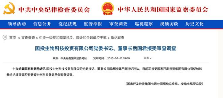 2月17日晚间,中共中央纪律监察委员会官网显示,国投生物科技投资有限公司(以下简称“国投生物科技”)党委书记、董事长岳国君涉嫌严重违纪违法,目前正接受国家开发投资集团有限公司纪检监察组纪律审查和安徽省池州市监察委员会监察调查。