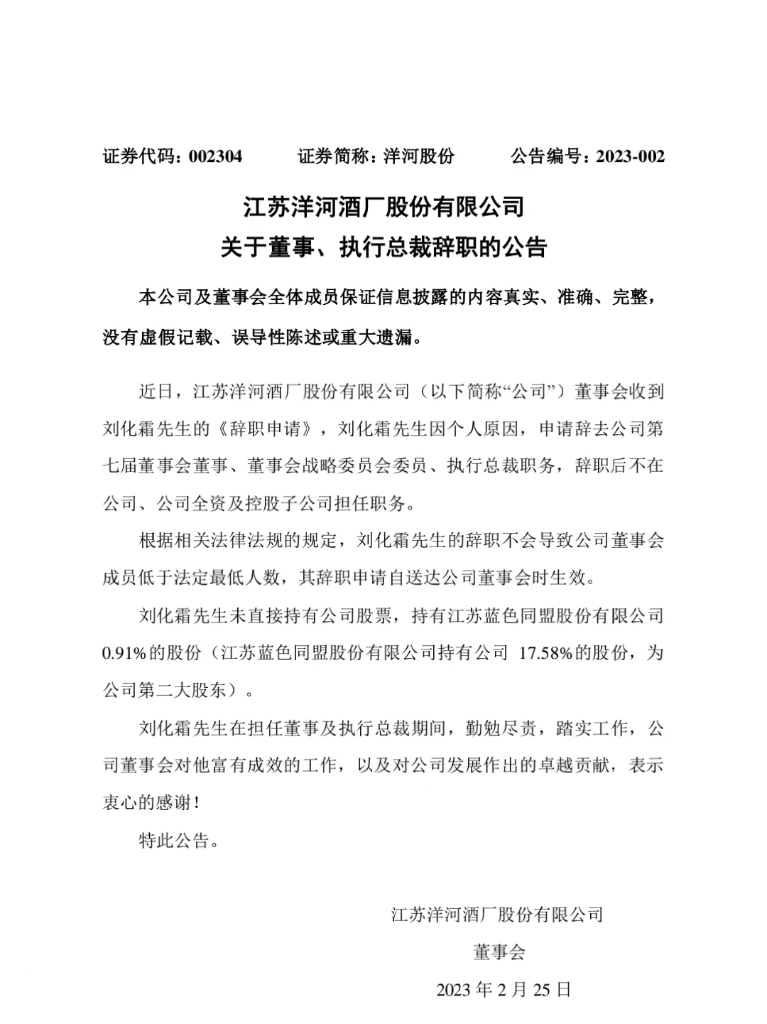 大公快消讯 2月24日,洋河股份发布公告称,刘化霜先生因个人原因,申请辞去公司第七届董事会董事、董事会战略委员会委员、执行总裁职务,辞职后不在公司、公司全资及控股子公司担任职务。