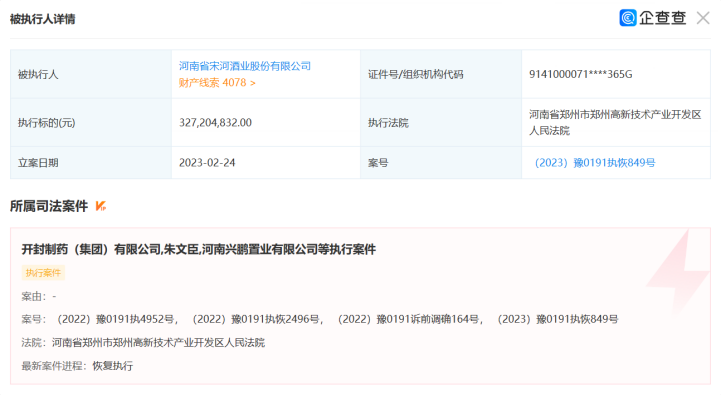 企查查显示,此次执行法院为郑州高新技术产业开发区人民法院,案号(2023)豫0191执恢849号,立案日期为2023年2月24日,被执行人包括开封制药(集团)有限公司、朱文臣、河南兴鹏置业有限公司、河南省宋河酒业股份有限公司(以下简称“宋河酒业”)、辅仁药业集团有限公司执行标的约3.27亿元。