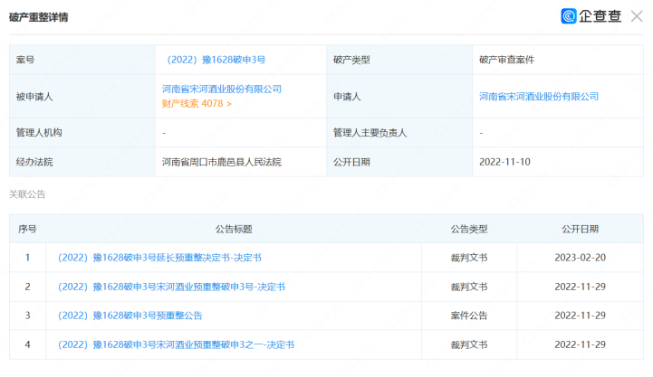 据了解,2022年11月2日,宋河酒业申请重整,并同时申请预重整。2022年11月10日,鹿邑县人民法院决定对宋河酒业进行预重整。但在2023年2月9日,其预重整管理人以预重整期间受疫情影响严重,部分重要工作如审计评估、重整投资人招募尚未最终完成为由,向本院申请延长预重整期间三个月。最终,法院决定将时间延至2023年5月10日。
