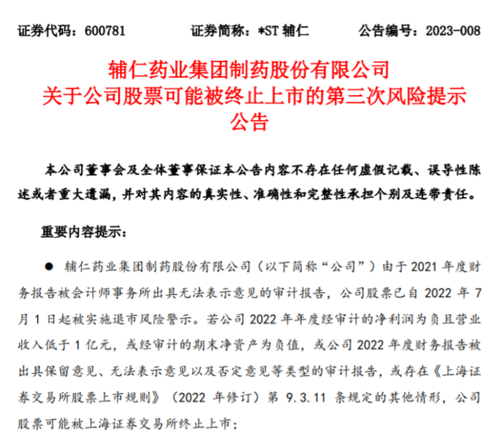 在2023年2月的最后一天,辅仁药业发布关于公司股票可能被终止上市的第三次风险提示公告。公告称,公司已触即一条终止上市情形——经审计的期末净资产为负值,或者追溯重述后最近一个会计年度期末净资产为负值。