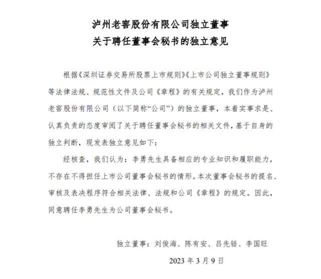 大公快消讯 3月10日,泸州老窖发布独立董事关于聘任董事会秘书的独立意见。公告称,独立董事刘俊海、陈有安、吕先锫、李国旺认为,同意聘任李勇为公司董事会秘书。