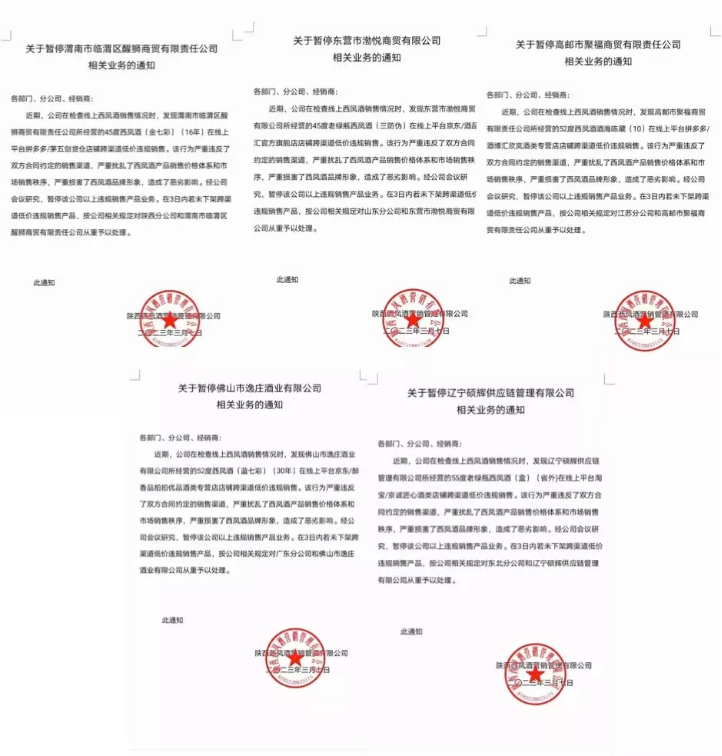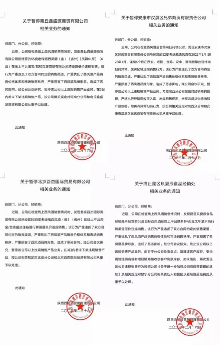 西凤酒认为,这些经销商的跨渠道低价违规销售严重扰乱了西凤酒产品销售价格体系和市场销售秩序,严重损害了西凤酒品牌形象,造成恶劣影响,所以决定暂停或者终止相关公司的违规销售产品业务合作。