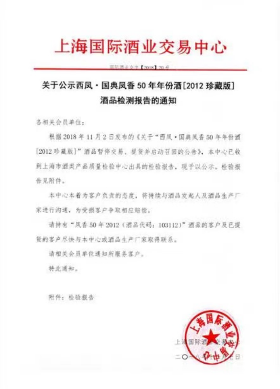报告显示,西凤年份酒的邻苯二甲酸异丁酯(DIBP,俗称“增塑剂”)检测结果为1.44mg/kg,报告为限值0.5mg/kg;邻苯二甲酸二正丁酯(DBP,俗称“塑化剂”)检测结果为1.02mg/kg,对应限值为0.3mg/kg。前述检测结果是上海市酒类产品质量检验中心有限公司,在上海酒业交易中心的送样委托下,对三瓶60%vol、500ml/瓶的西凤年份酒检测得出。