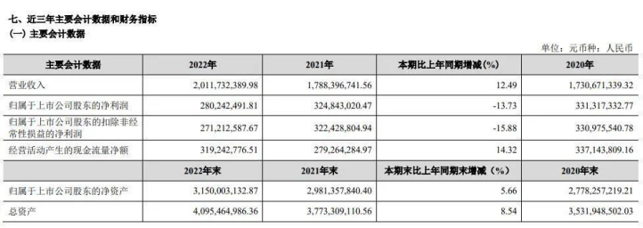 金徽酒财报显示,公司2022年实现营业收入约20.12亿元,同比增长12.49%;归属于上市公司股东的净利润(下称净利润)约2.8亿元,同比下滑13.73%;归属于上市公司股东的扣除非经常性损益的净利润(下称扣非净利润)约2.71亿元,同比下滑15.88%。