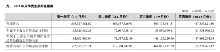 分季度看,2021年四个季度营收分别为5.08亿元、4.64亿元、3.69亿元、4.47亿元,分别同比增长48.43%、25.6%、10.65%、-34.74%;净利润分别为1.15亿元、0.72亿元、0.56亿元、0.82亿元,分别同比增长99.34%、15.58%、44.31%、-52.61%。