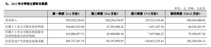 分季度看,2022年四个季度营收分别为7.055亿元、5.2亿元、3.35亿元、4.5亿元,同比增长38.79%、12.23%、9.12%、0.69%;净利润分别为1.65亿元、0.47亿元、185.12万元、0.66亿元,同比增长42.78%、-34.5%、-96.68%、-18.63%。