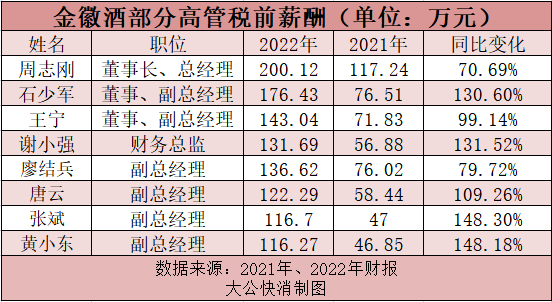 其中,周志刚作为金徽酒董事长、总经理,2022年从公司获得的税前报酬总额为200.12万元,较2021年的117.24万元同比增长了70.69%。