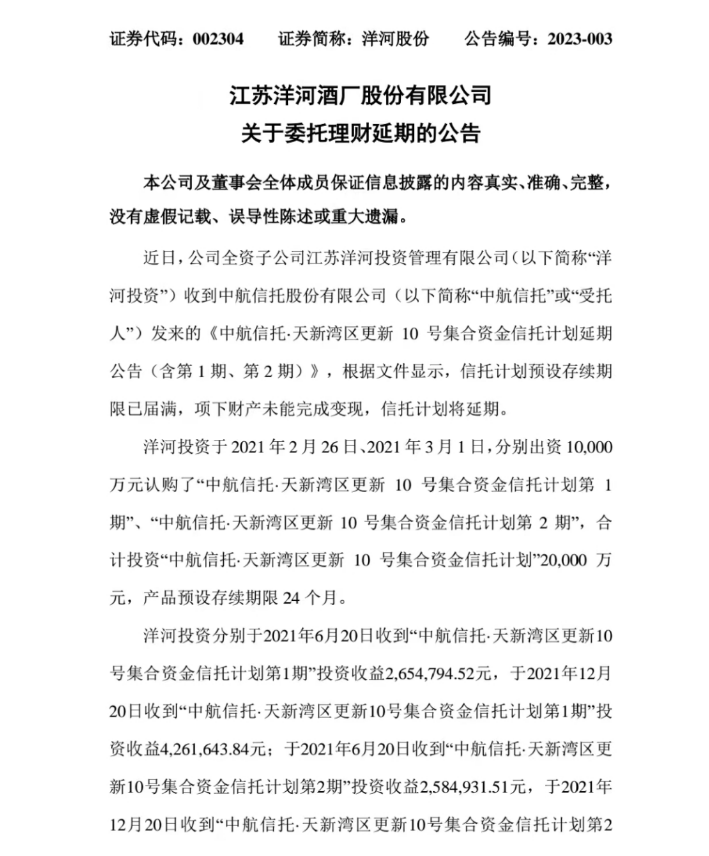 近日,洋河股份发布委托理财延期公告。公告称,其全资子公司江苏洋河投资管理有限公司(以下简称“洋河投资”)收到中航信托发来的《中航信托·天新湾区更新10号集合资金信托计划延期公告(含第1期、第2期)》,根据文件显示,信托计划预设存续期限已届满,项下财产未能完成变现,信托计划将延期。