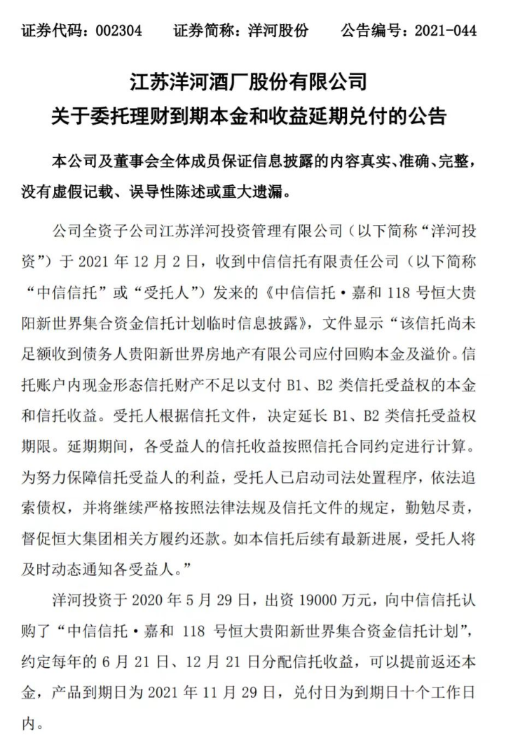 早在2021年12月初,洋河股份曾发布公告称,出资1.9亿元认购的中信信托管理的投向恒大贵阳一项目的信托产品,约1.68亿本金与收益到期无法兑付。