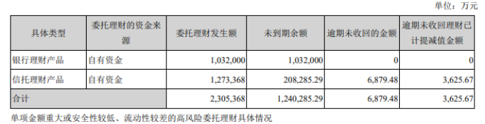 其中银行理财103.2亿元,信托理财127.34亿元。未到期余额达到124.03亿元,其中银行理财103.2亿元,委托理财20.83亿元。