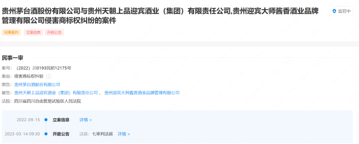 此前,贵州茅台将贵州天朝上品迎宾酒业、贵州迎宾大师酱香酒业告上法庭一事引发广泛关注。大公快消注意到,该案已于2023年3月14日发布开庭公告,将于4月下旬在四川自由贸易试验区人民法院开庭。