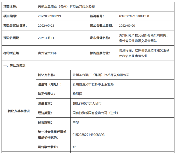 早在2022年5月23日,据贵州阳光产权交易所有限公司官网文件披露,茅台技开公司就已转让天朝上品酒业(贵州)有限公司51%的股权。