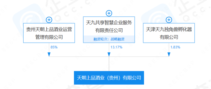 目前,天朝上品酒业(贵州)有限公司的大股东为贵州天朝上品酒业运营管理有限公司,持股比例85%,天九共享智慧企业服务有限责任公司持股13.17%,天津天九独角兽孵化器有限公司持股1.83%。