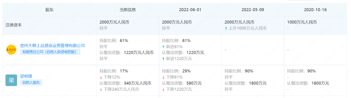 2022年5月10月,贵州迎宾酒股份有限公司发生重大股权变更。梁明锋持股比例从90%降至29%,承接61%股权的也正是贵州天朝上品酒业运营管理有限公司。