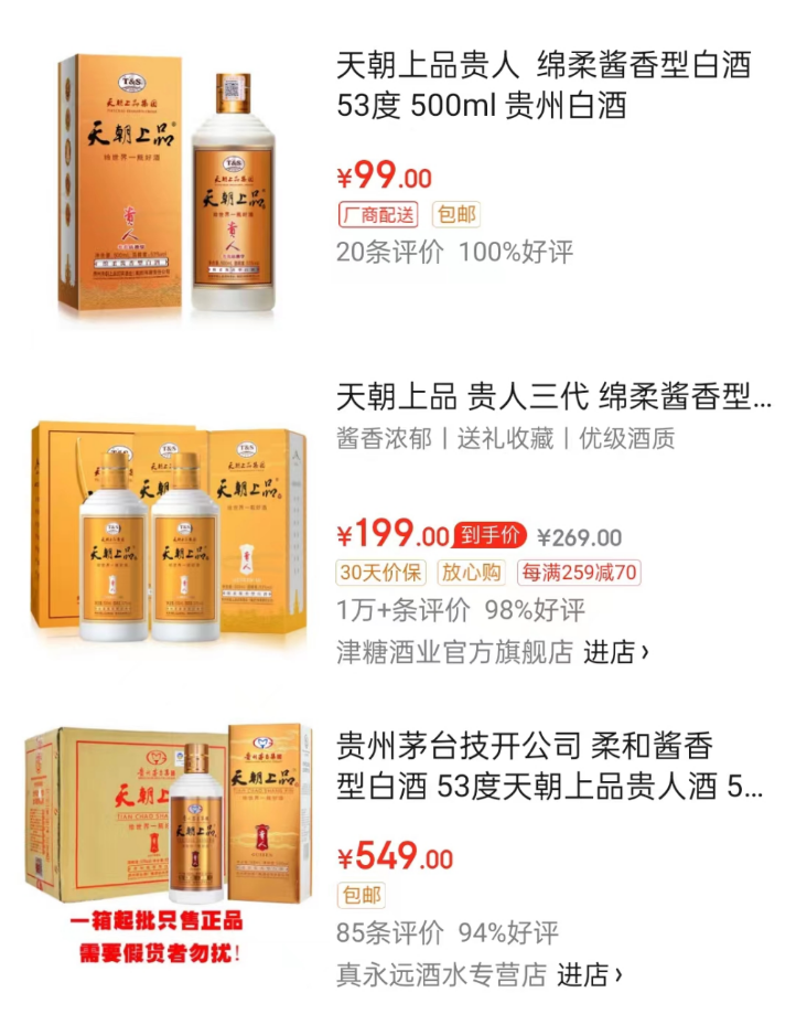 在此之前,天朝上品酒业曾因价格虚高、定价混乱等问题引起消费者广泛关注。大公快消搜索天朝上品官方网站发现,天朝上品旗下贵人酒官方市场指导价为699元。但从天猫、京东等电商平台上搜索该品牌发现,天朝上品产品售价差距较大,为几十至上百元不等。