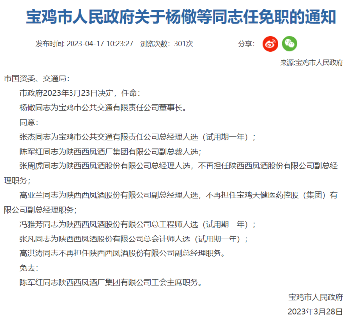 大公快消讯 4月17日,宝鸡市人民政府发布一份任免职通知(宝政任字【2023】5号),其中涉及陕西西凤酒厂集团和股份公司多名高管。