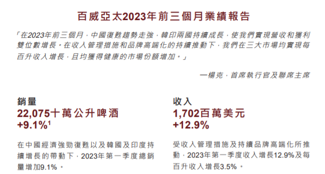 大公快消讯 5月4日,百威亚太控股有限公司发布截至2023年3月31日止三个月的未经审核业绩。