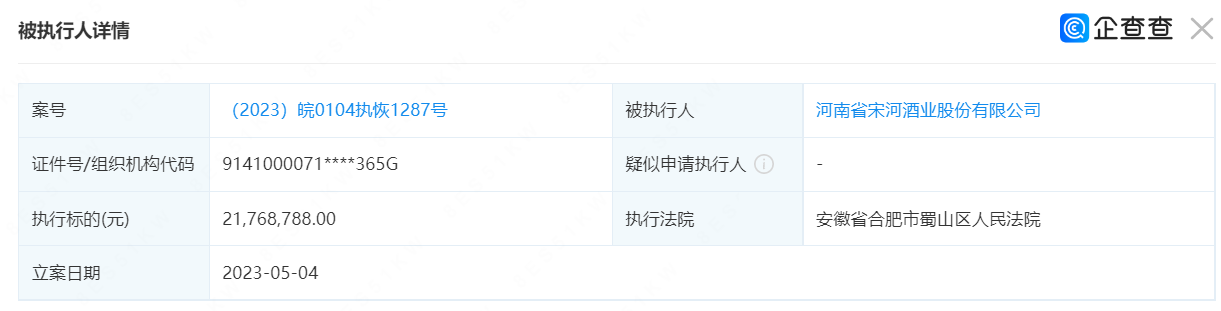企查查显示,此次执行法院为安徽省合肥市蜀山区人民法院,案号(2023)皖0104执恢1287号,立案日期为2023年5月4日,被执行人包括朱文臣、朱景升、河南省宋河酒业股份有限公司(下称宋河酒业)、河南辅仁怀庆堂制药有限公司、辅仁药业集团有限公司,执行标的约2176.88万元。