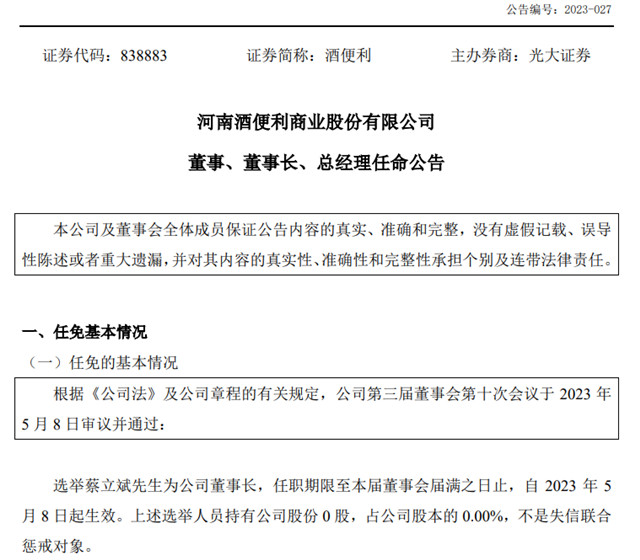 另一条公告显示,酒便利选举蔡立斌为公司新任董事长、总经理。同时,补选冯文娟、汤鹏、成冬冬为酒便利新任董事,任职期限至本届董事会届满之日止,自2023年5月8日起生效。