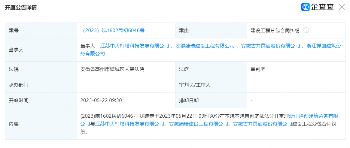 大公快消讯 据企查查消息,浙江祥创建筑劳务有限公司起诉安徽古井贡酒股份有限公司、江苏中大杆塔科技发展有限公司、安徽臻瑞建设工程有限公司建设工程分包合同纠纷,将于5月22日9时30分在安徽省亳州市谯城区人民法院开庭。