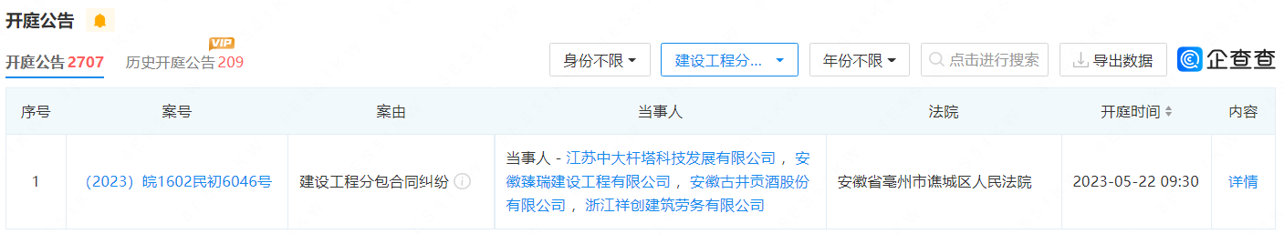 安徽古井贡酒股份有限公司成立于1999年3月5日,法人为梁金辉,注册资本为5.286亿元,经营范围包括粮食收购、生产白酒等,旗下产品为古井贡酒。另据企查查信息显示,截至目前,在古井贡酒2707次开庭公告中,这是唯一一次案由为建设工程分包合同纠纷的公告。